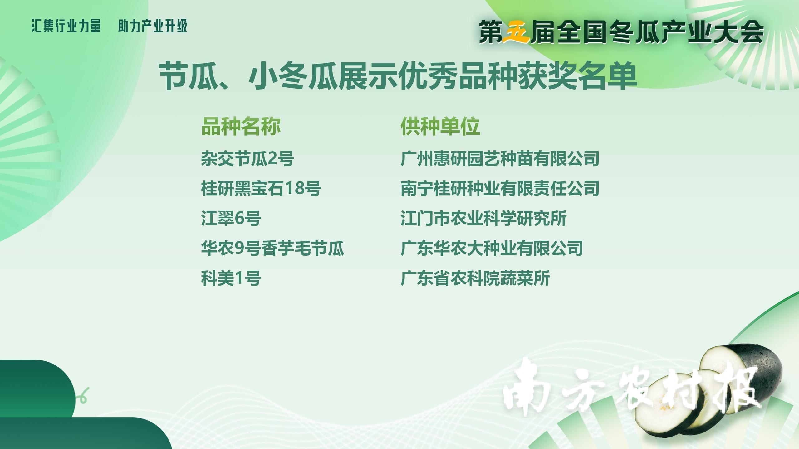 6月21日,第五届全国冬瓜产业大会在广州举办,会上发布了“冬瓜展示优秀品种”、“节瓜、小冬瓜展示优秀品种”、“冬瓜王擂台赛金银铜奖”。本届大会品种评选活动共征集到全国205个新优品种,108个大冬瓜品种、97个小冬瓜和节瓜品种同台竞技,全方位展现了我国冬瓜品种的丰富性和多元性。